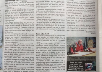 The crew of the MV Portland has prepared this letter to the editor of the Portland Observer in response to the one in the newspaper from the manager of the smelter, Peter Chellis on January 1
