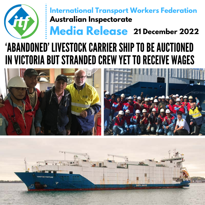 An international livestock carrier ship, the Yangtze Fortune, has been arrested in Portland, Victoria by the Australian Federal Court. In the meantime, AMSA and the ITF are working with the Admiralty Marshall to support the crew after the ship's owner failed to pay their wages or meet its obligations under international maritime law.