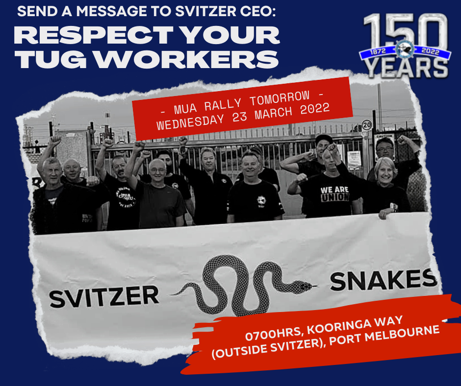 The Maritime Union of Australia’s Victorian Branch will rally outside the tug company’s offices on Wednesday morning (March 23), calling on the CEO to step in to avoid further escalations of the ongoing industrial dispute being led by Svitzer management.