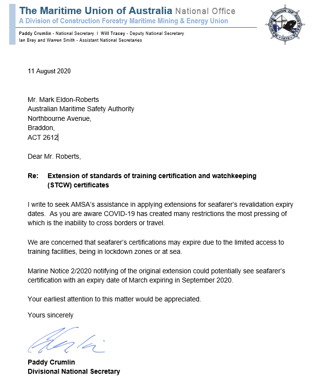 The MUA has written to AMSA to request a further extension to the expiry date of seafarer certification due to COVID19. AMSA previously extended seafarer certification expiry between March and October but the MUA has requested this be extended due to the inability for seafarers to travel to colleges to revalidate.