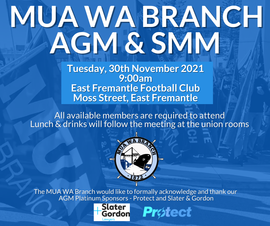 The Maritime Union of Australia Annual General Meeting & Special Meeting of Members will take place on Tuesday, 30th November 2021.