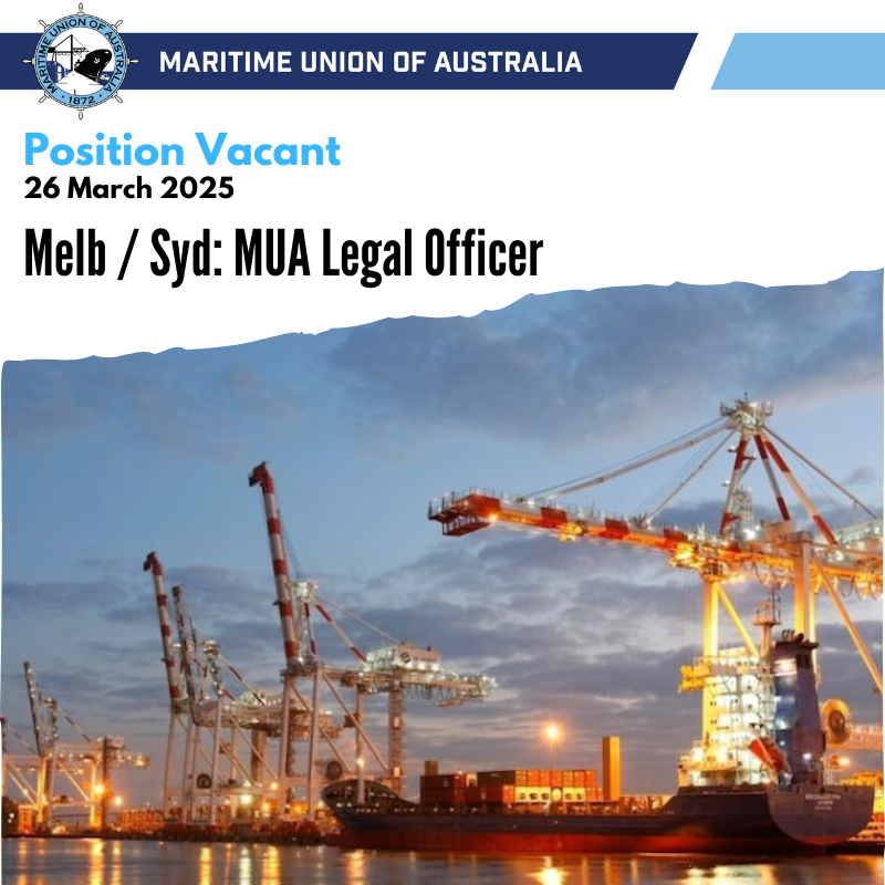The Maritime Union of Australia Division (MUA) of the Construction, Forestry and Maritime, Employees Union (CFMEU) is seeking an experienced legal practitioner to provide legal and strategic industrial advice and representation to the Officials and Members of the MUA.