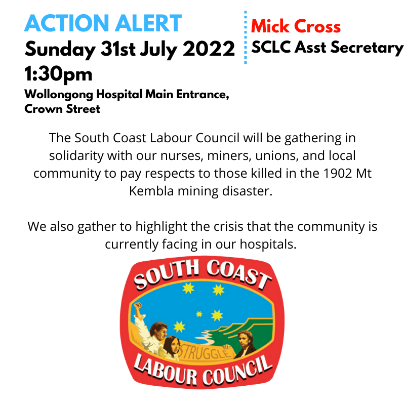 On Sunday 31st July at 1.30pm Wollongong Hospital Main Entrance, Crown Street. The South Coast Labour Council will be gathering in solidarity with our nurses, miners, unions, and local community to pay respects to those killed in the 1902 Mt Kembla mining disaster. We also gather to highlight the crisis that the community is currently facing in our hospitals.