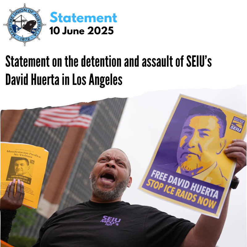 The MUA, alongside the over 700 global transport trade unions that make up the International Transport Workers’ Federation (ITF), condemn the violent assault and detention of SEIU Local USWW President David Huerta by ICE agents in Los Angeles.