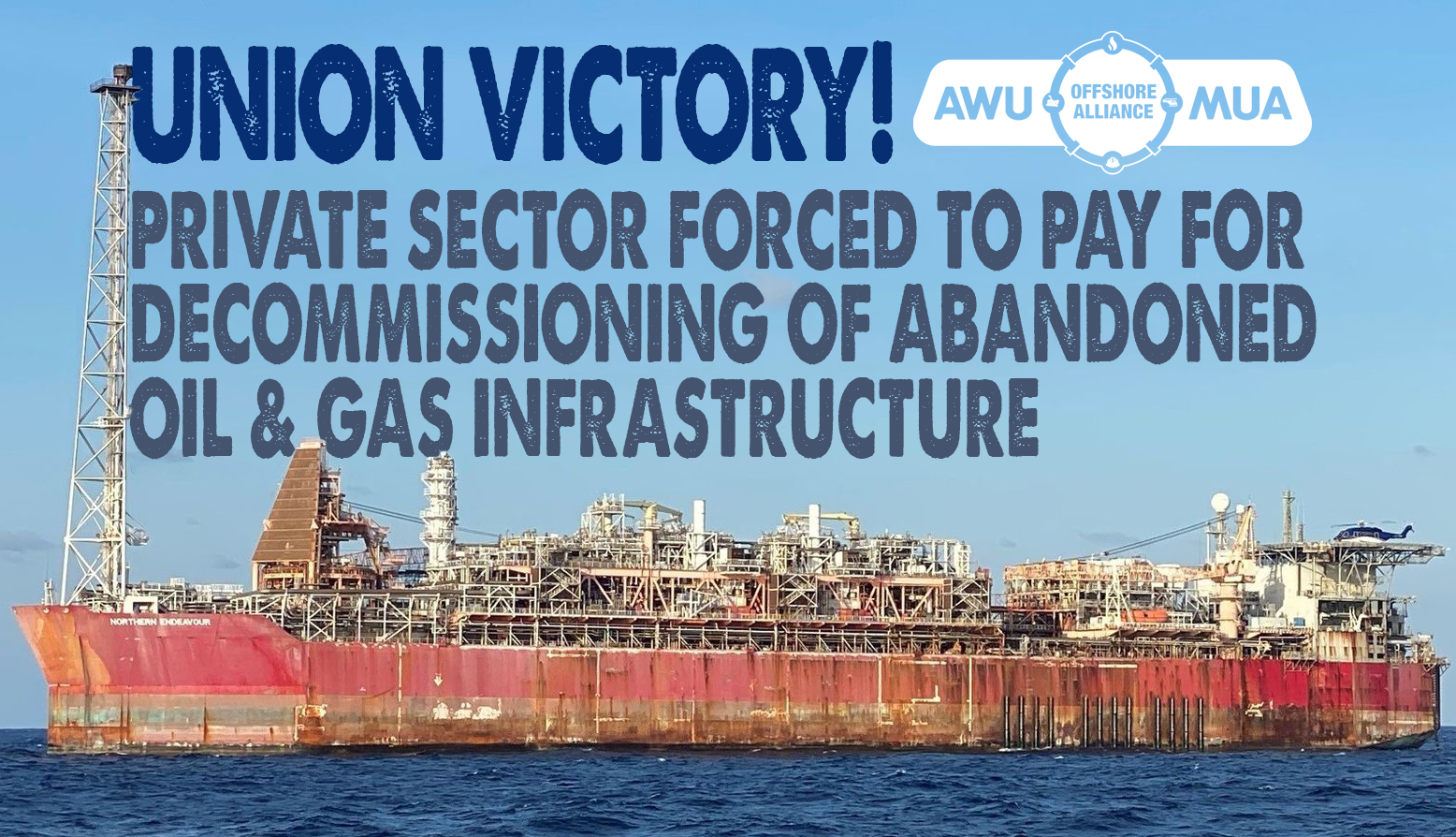 The union will continue its campaign to ensure the hundreds of already-disused offshore oil and gas wells, platforms and facilities around the Australian coast are properly decommissioned and fully removed and remediated. This work must provide good union jobs and be undertaken at a local decommissioning and recycling yard.