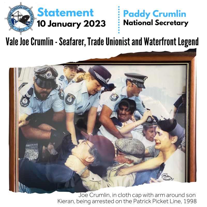 During the 1998 waterfront dispute, Joe – together with my brother Kieran and other members of our family – was arrested on the Patrick picket line in Sydney. He was a passionate, erudite, and lifelong advocate and activist for trade union rights and the rebuilding of the Australian Merchant Navy. He was very active with many of our veterans in the Merchant Navy Association and other seafaring bodies.