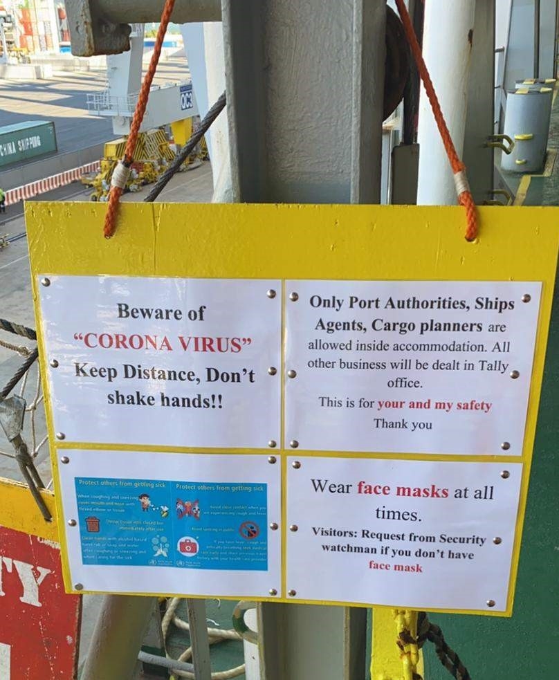Coronavirus warning signage have now been installed on the gangway, with access to the vessel limited, visitors required to wear face masks at all times, and maritime workers warned not to shake hands with the crew.